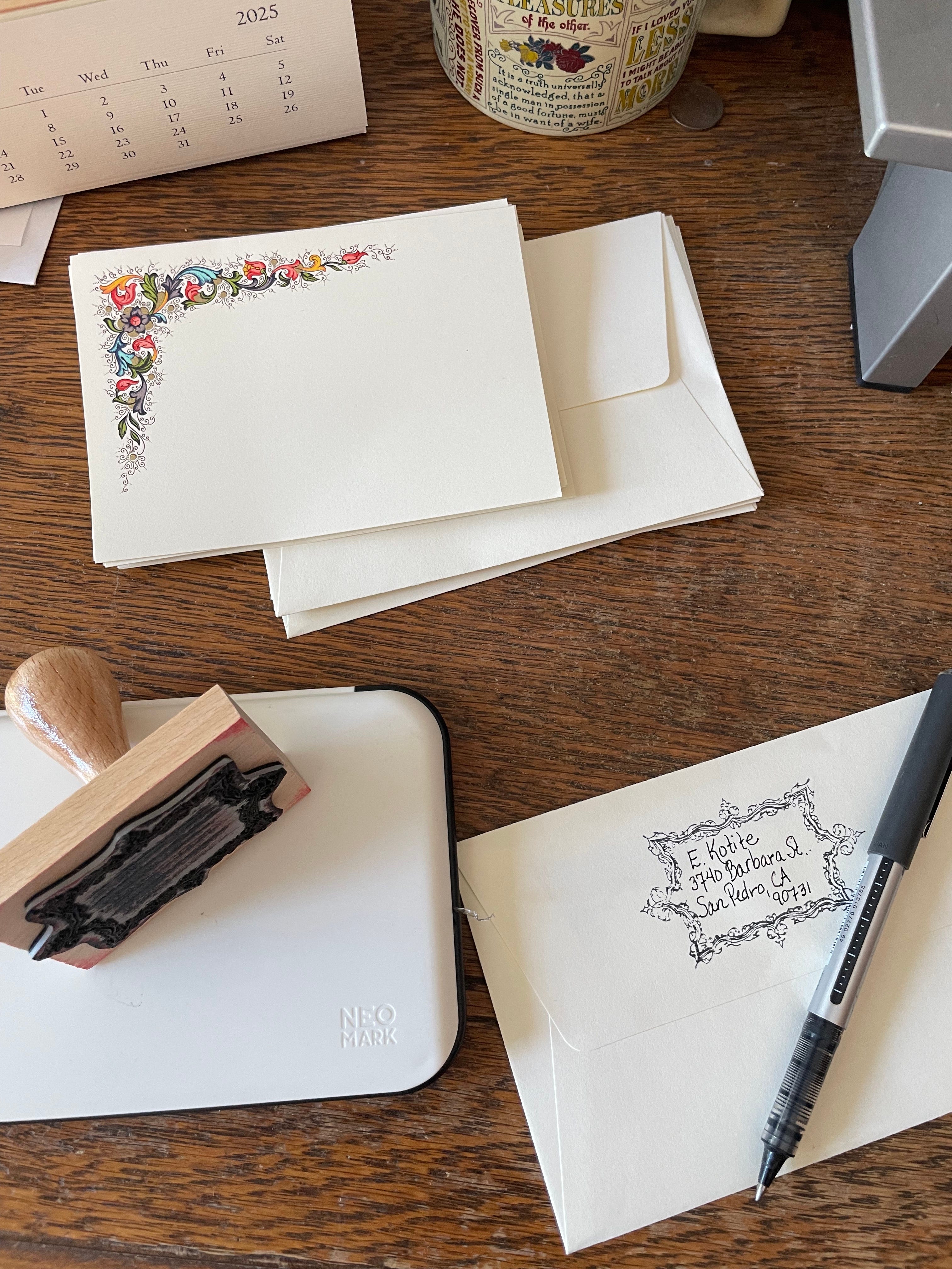 I found an intricate rectangular shape (here are some similar ones) and decided to use it as a framework for my handwritten return address. It added instant appeal to a simple thank-you notecard I sent to a friend. It is also fun to stamp quick notes to your family or highlight parts of your journal or notebook that are important.