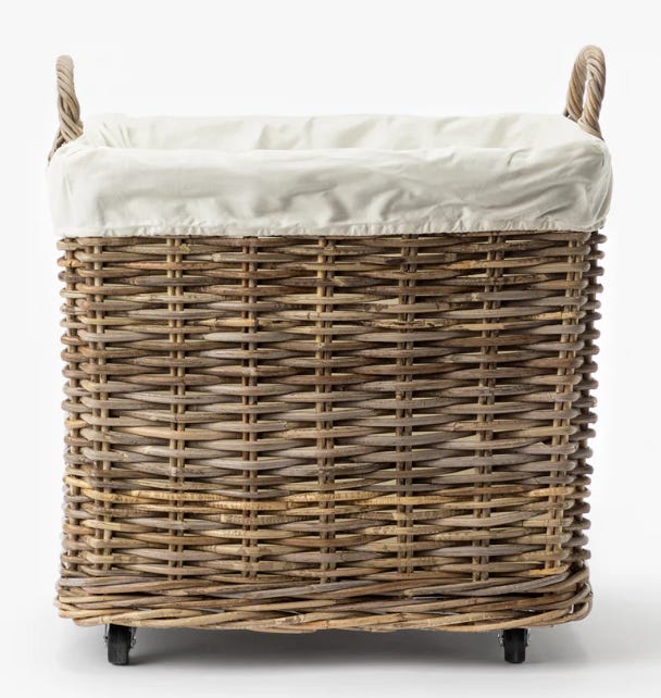 Whose laundry basket looks like this? Not mine, sadly. This handsome wicker basket is made practical with small wheels that really take a load off. (Photo: McGee & Co.)