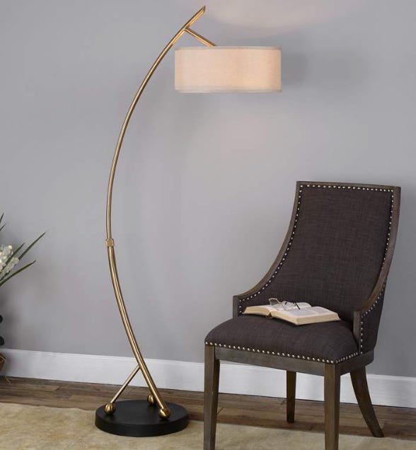 The Uttermost Vardar, a floor lamp with a modern curve provides understated “oomph” to a reading chair. It’s not my usual style but I see this working in a well-appointed sitting space. (Photo: Lamps Plus)