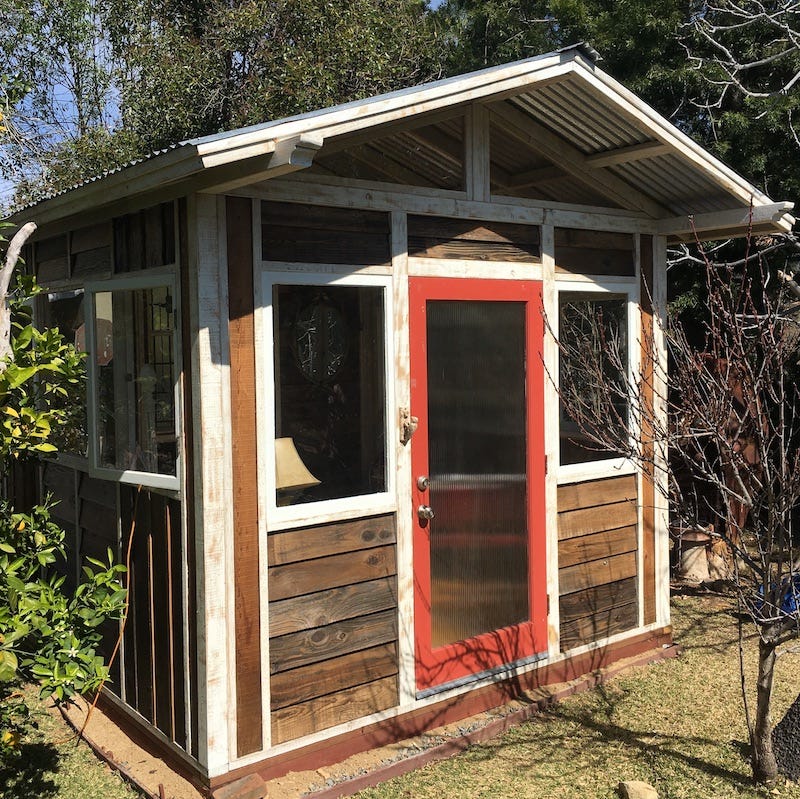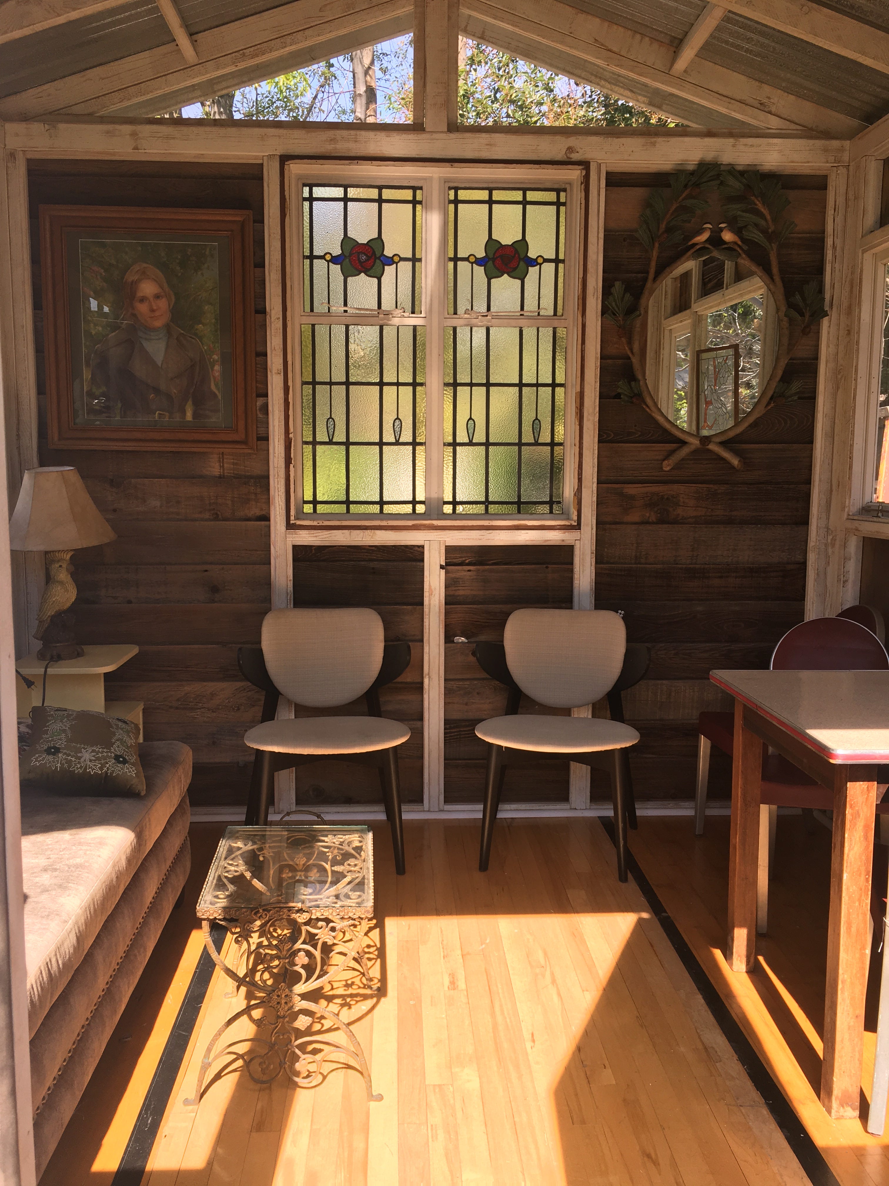 I worked with her and A Place to Grow to design a simple cottage shed using reclaimed materials. The big find was a chunk of basketball flooring from a 1950s gym teardown. Crossen had her own set of art glass windows that were incorporated into the back wall. The whole room is flooded with light.