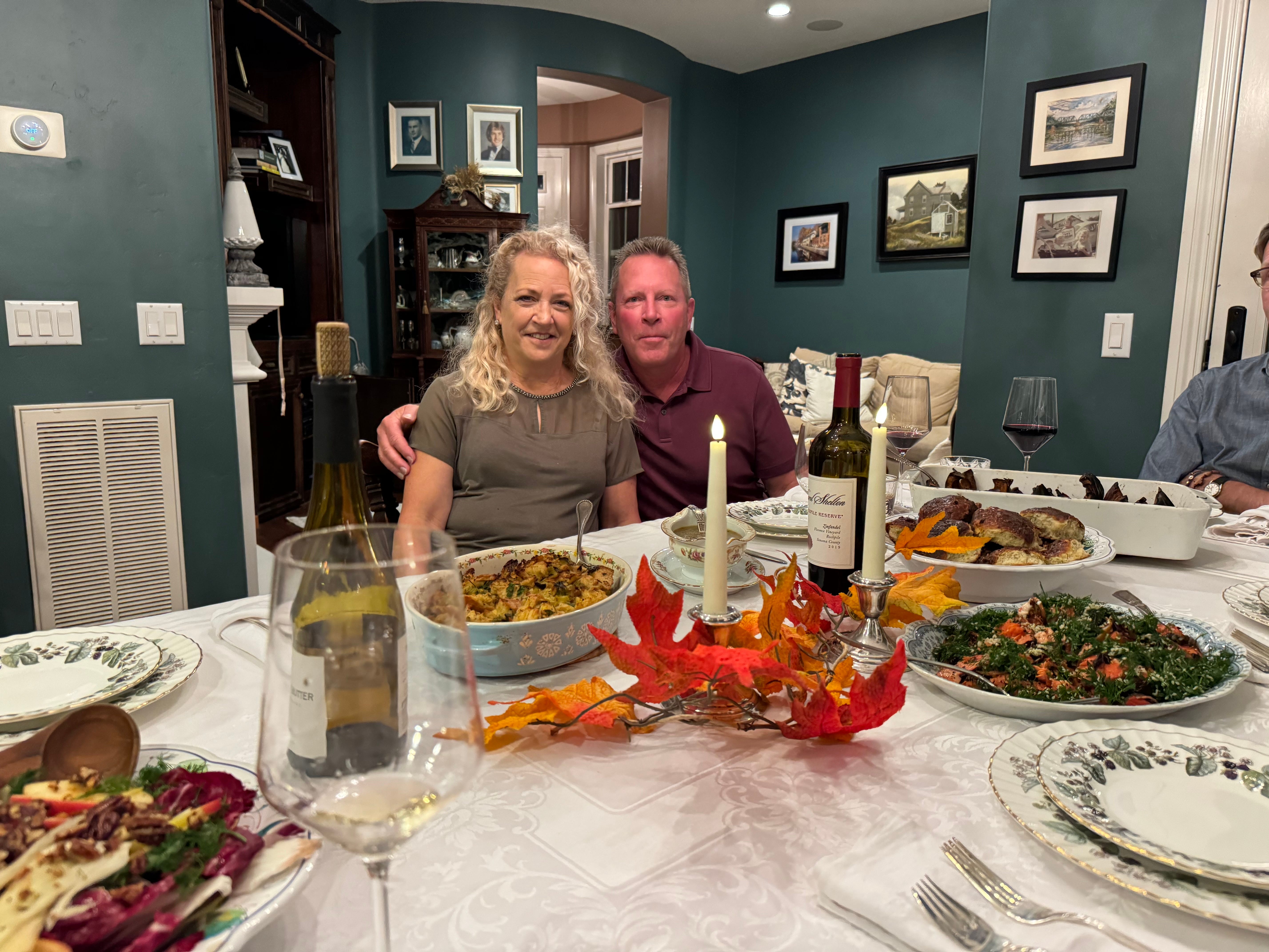 Me with my husband Tim, waiting for our guests to arrive (brother-in-law cut off on right). Thanksgiving 2023. Photo: Elizabeth Hayes