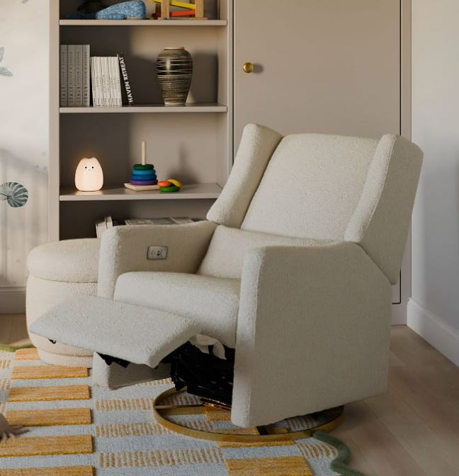 The new nursing chairs offer gliding and swivel motion, and sometimes they have a few reclining positions as well. This Babyletto is 41”h x 36”d x 29”w — most large recliners are 44”h x 42”d x 50”w. In a sitting area of about 12 ft. wide, this chair consumes more than 1/3 of the space.