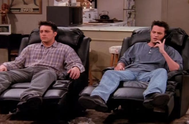 Built-in pillow cushions at the top of a recliner (see Joey’s and Chandler’s chairs) might be amazing for your aching head, but they are not amazing for anything else.