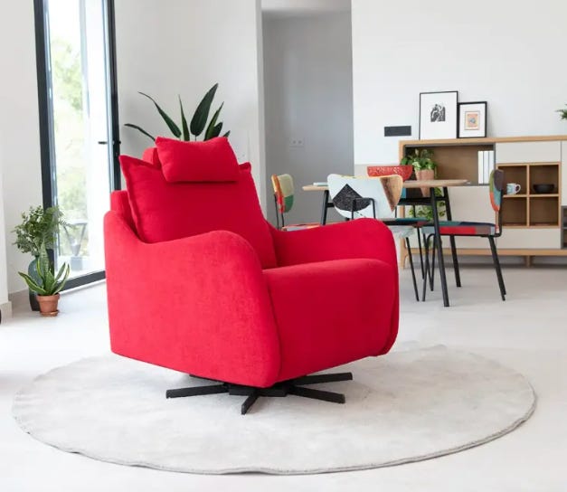 After ranting for a dozen paragraphs on ugly recliners, I now present one exception. A Spanish company named Fama makes a line of recliners with a playful European aesthetic. They come in both pattern and solid colors and offer a variety of dimensions, body styles and price.