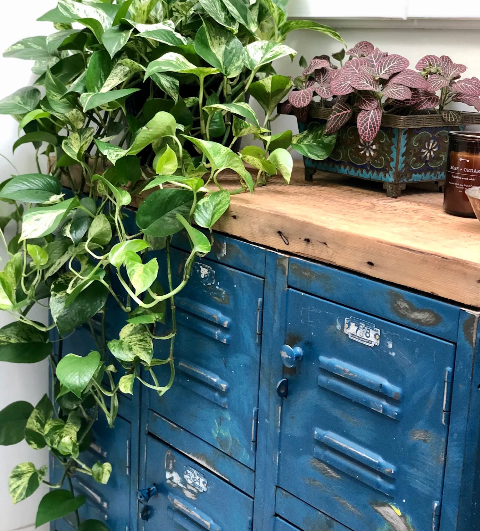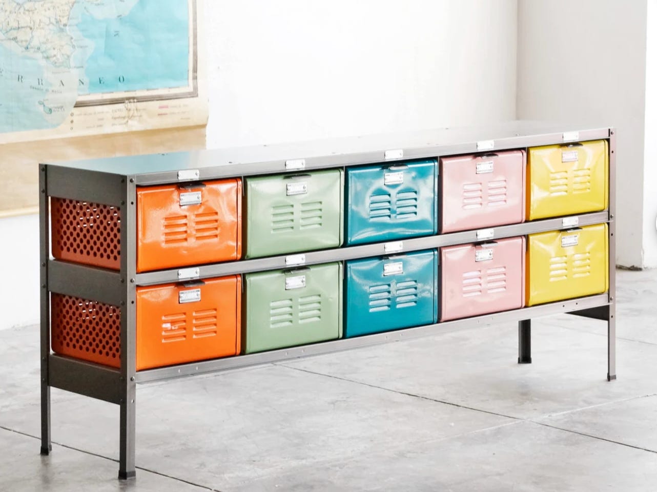 These metal baskets aren’t exactly lockers but they give the vibe. Locker furniture is often marketed to kids but grownups like them, too. (Photo: Rehab Vintage LA)