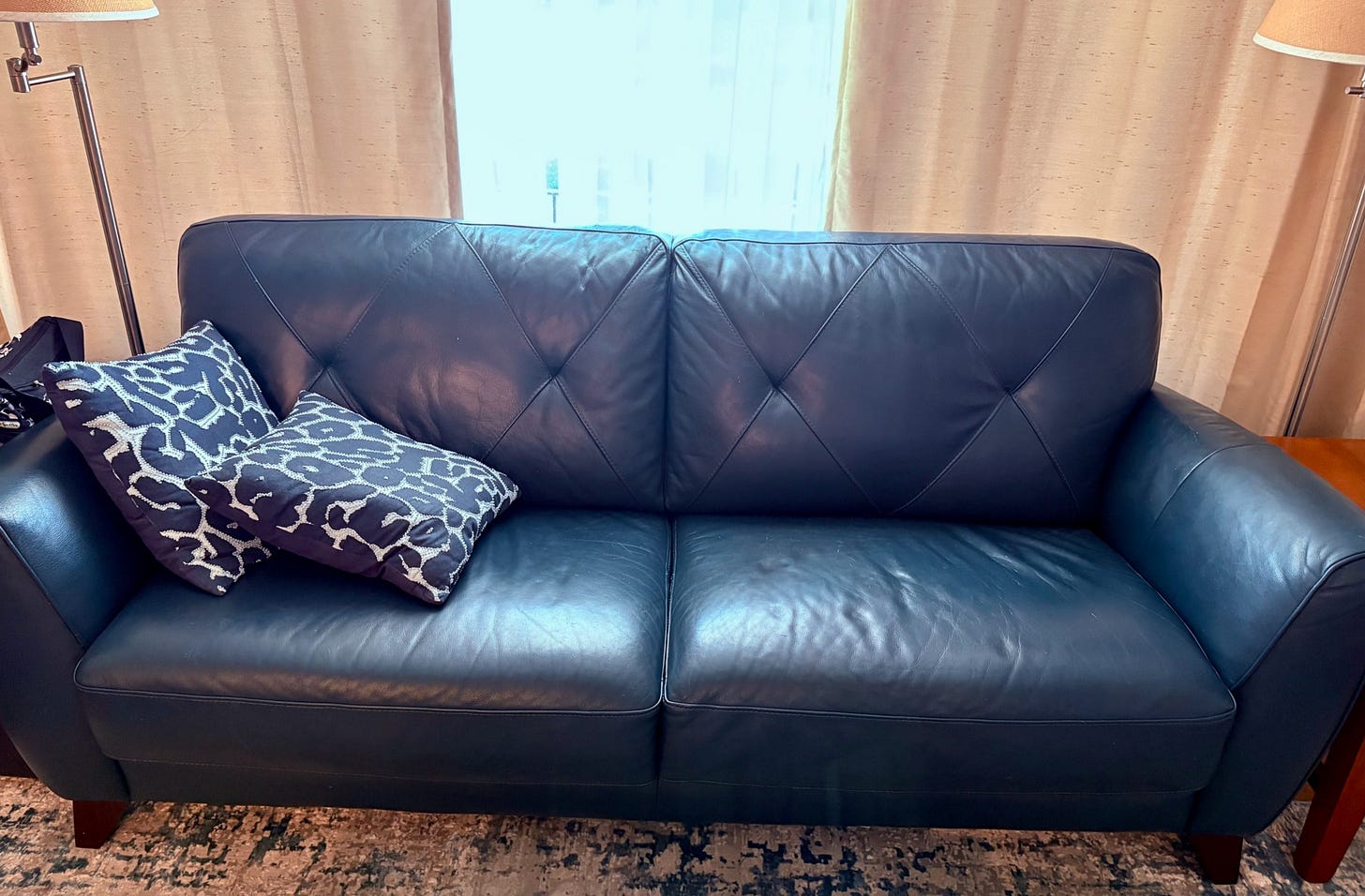 Karen’s smart blue leather couch was just the right size for their on-the-small-side living room. She hopes she never has to replace it or at least that she can find the same one to replace it with.