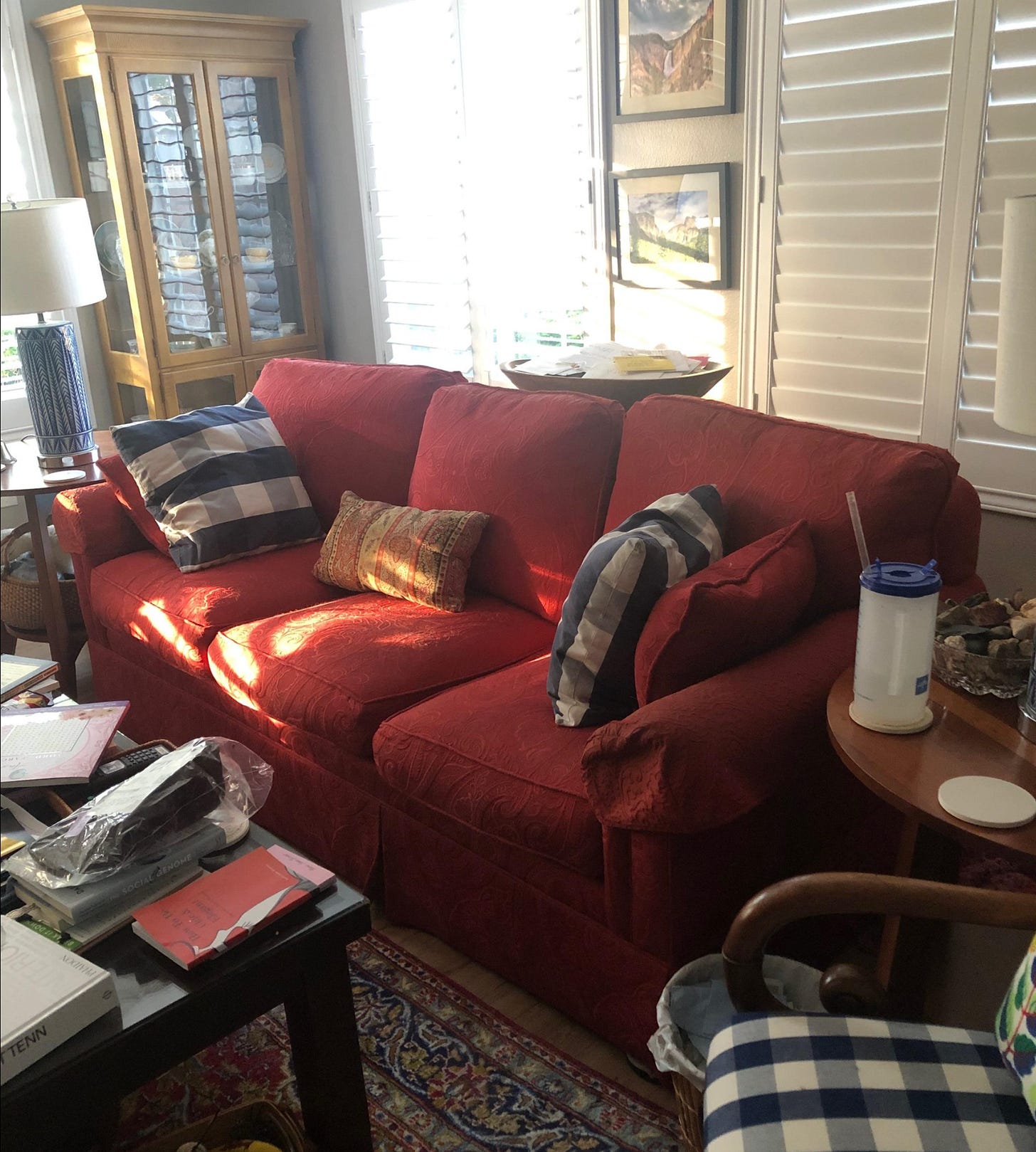 Viki splurged on a vibrant red jacquard fabric for her Ethan Allen couch she originally bought in 2005. It was reupholstered in 2018 and Viki is hoping to have it at least another 10 years.