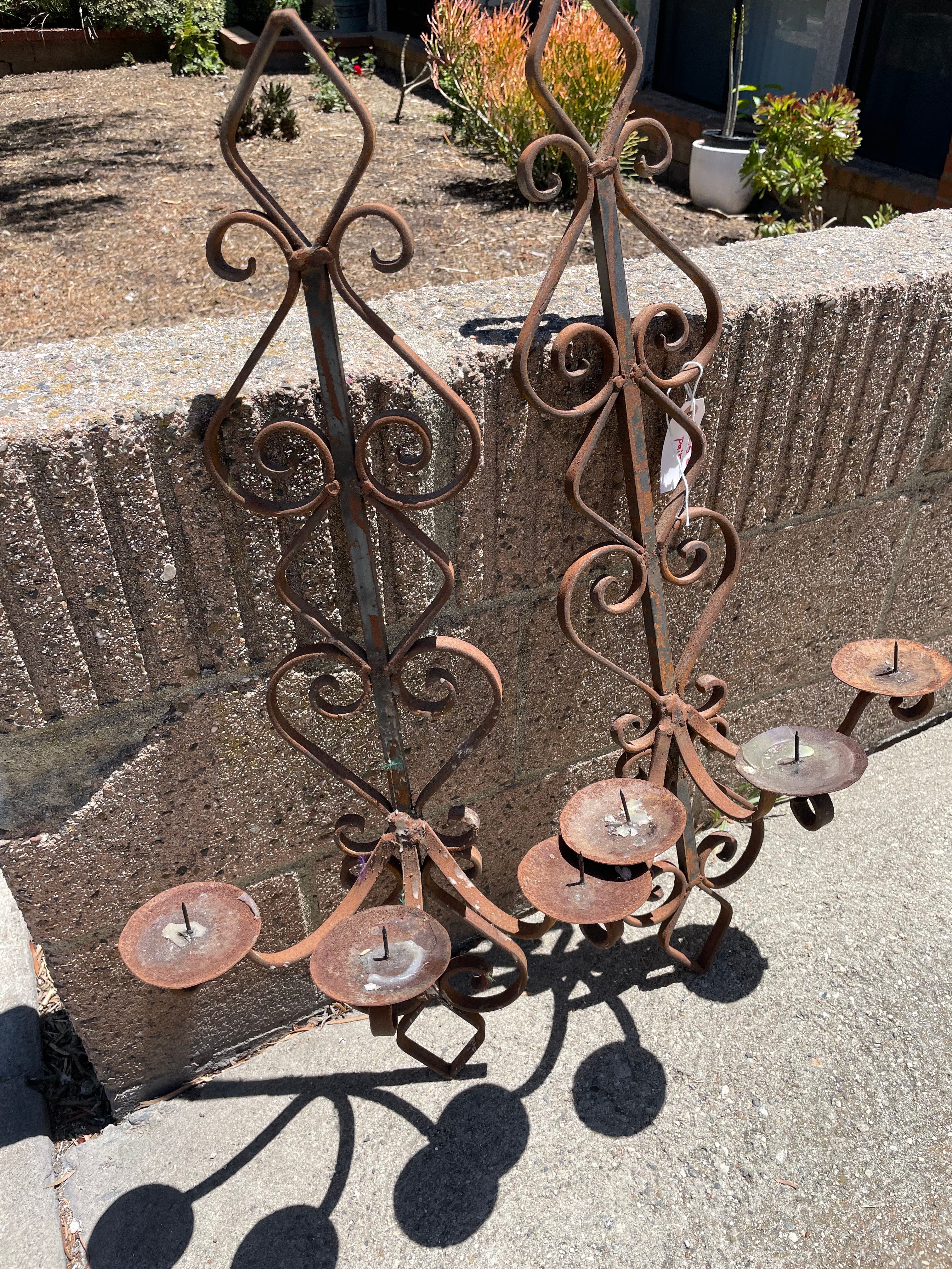 I started by examining the potting table’s placement. The brown walls surrounding it needed a bit of ornamentation. The day I went plant shopping I stopped by a local garage sale advertising plants. And while I didn’t like the plants they had left, I did spot these two iron wall candelabra.