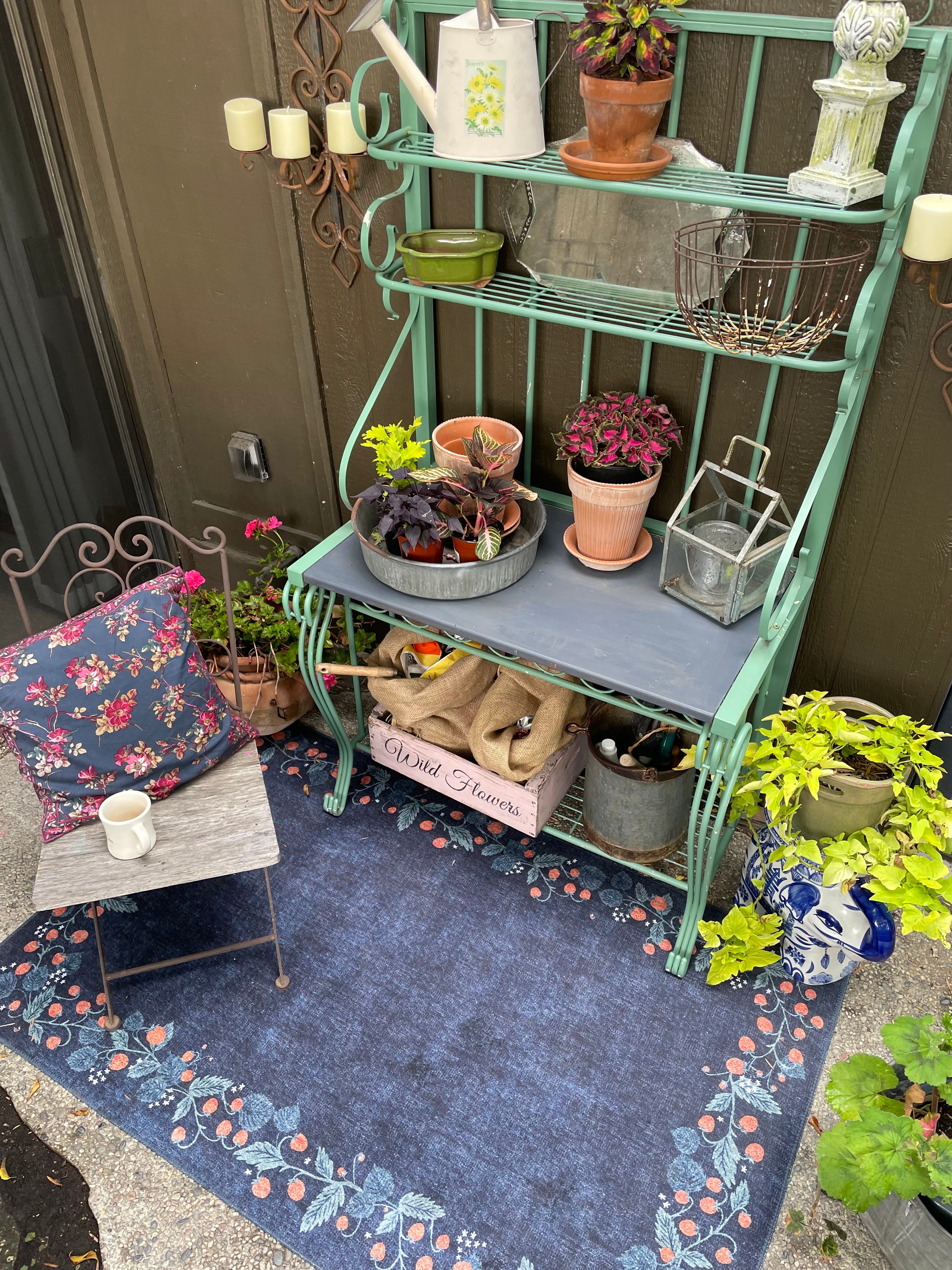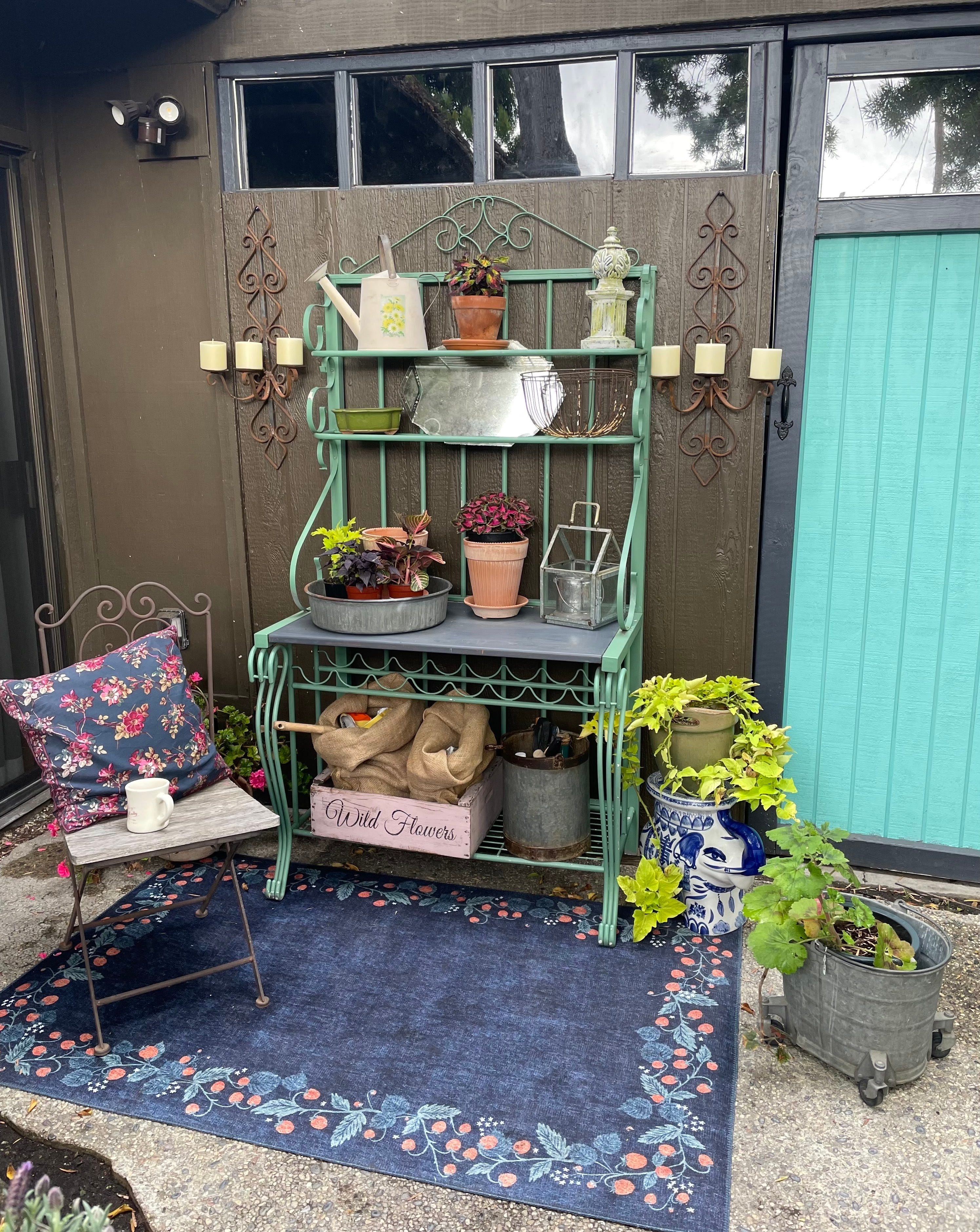 Another great way to define a zone in your back yard is with an outdoor rug. This 5 x 7 rug of dusty blue with a strawberry border was a lucky find at Home Goods. It makes a huge difference in my potting area.