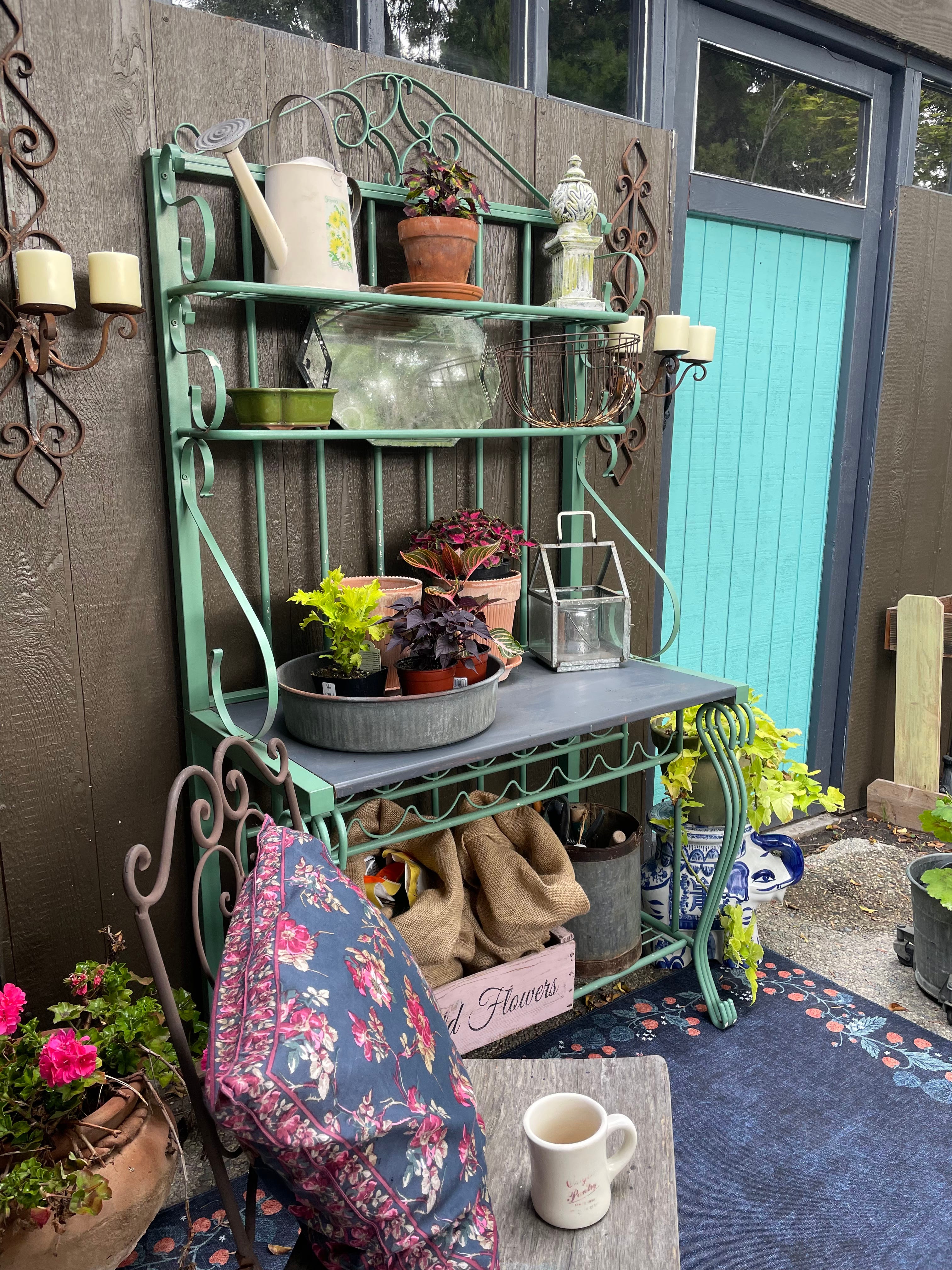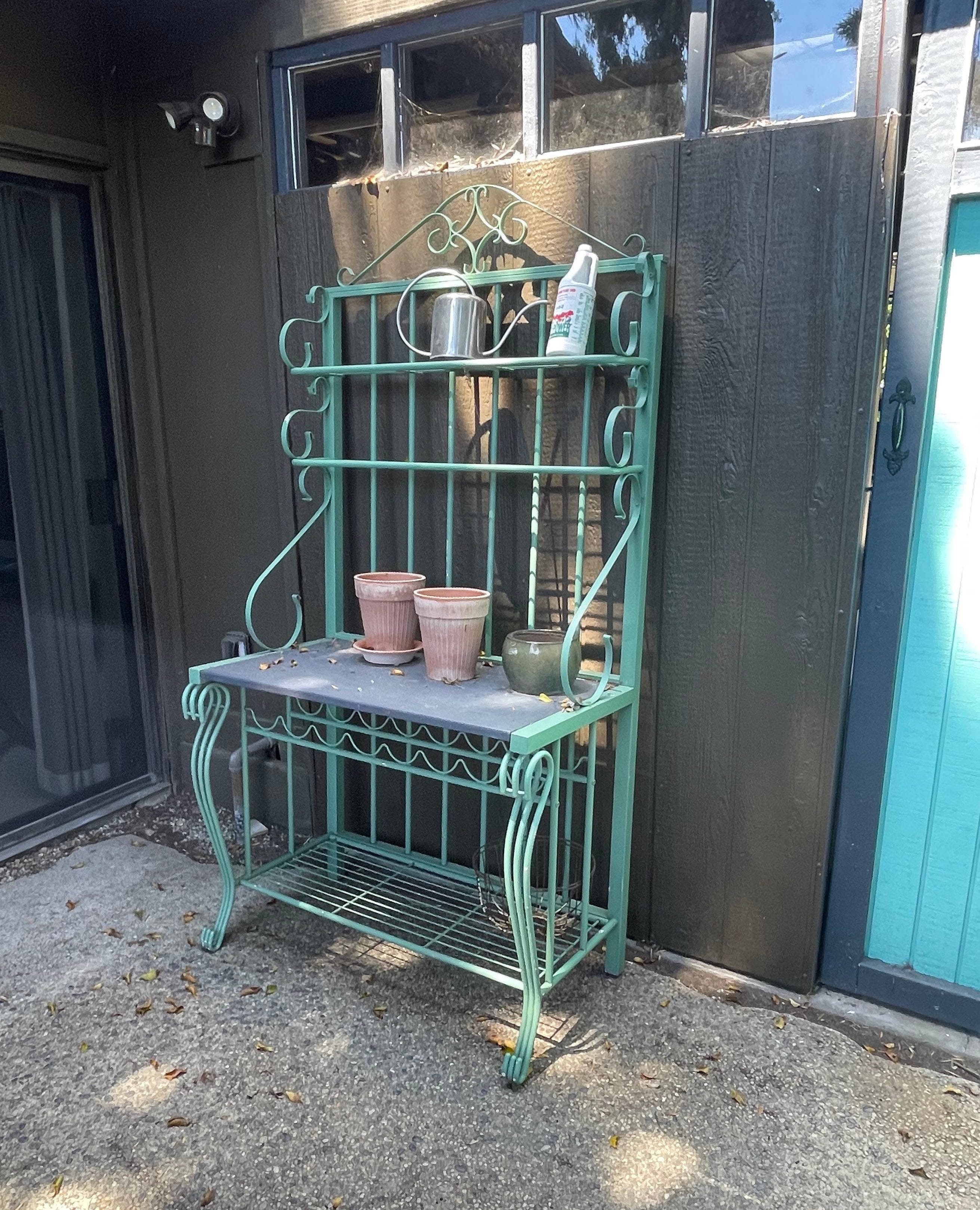 After neglecting the back yard for a few months, I went back to it recently to water and take a good look around. The baker’s rack/potting table I brought home after She Shed Living closed rested forlornly against a garage wall. It is very visible from the guest room’s sliding doors but even with this nice piece, the area was not looking well cared for. A potting table with no potting activity is a sad, sad thing.