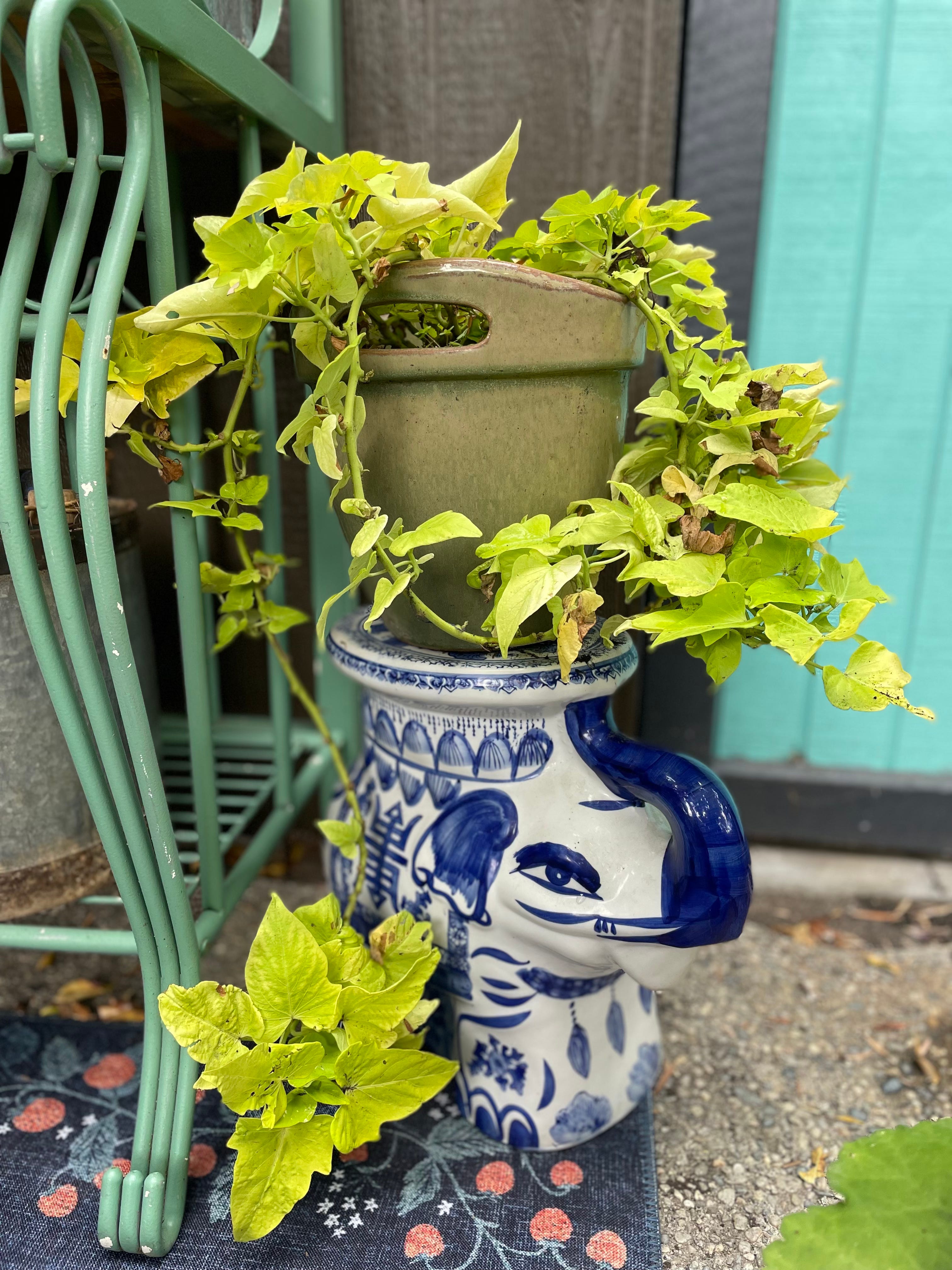 My sweet potato vine really appreciated the lift it got from this blue-and-white elephant plant holder