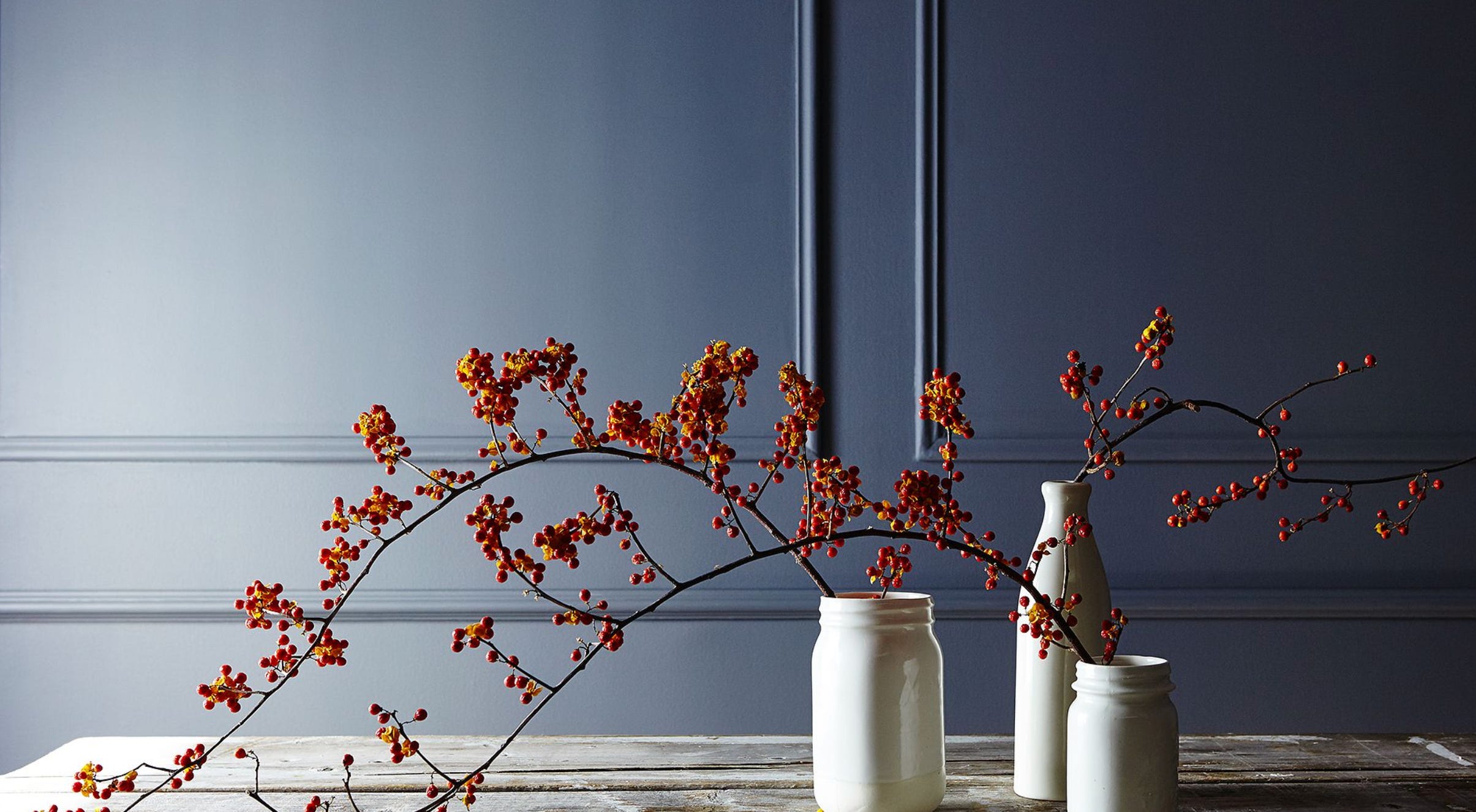 This horizontal arrangement of bittersweet is simple yet dramatic. Brass or earthy pottery containers would look great, too. (Photo: Food52)