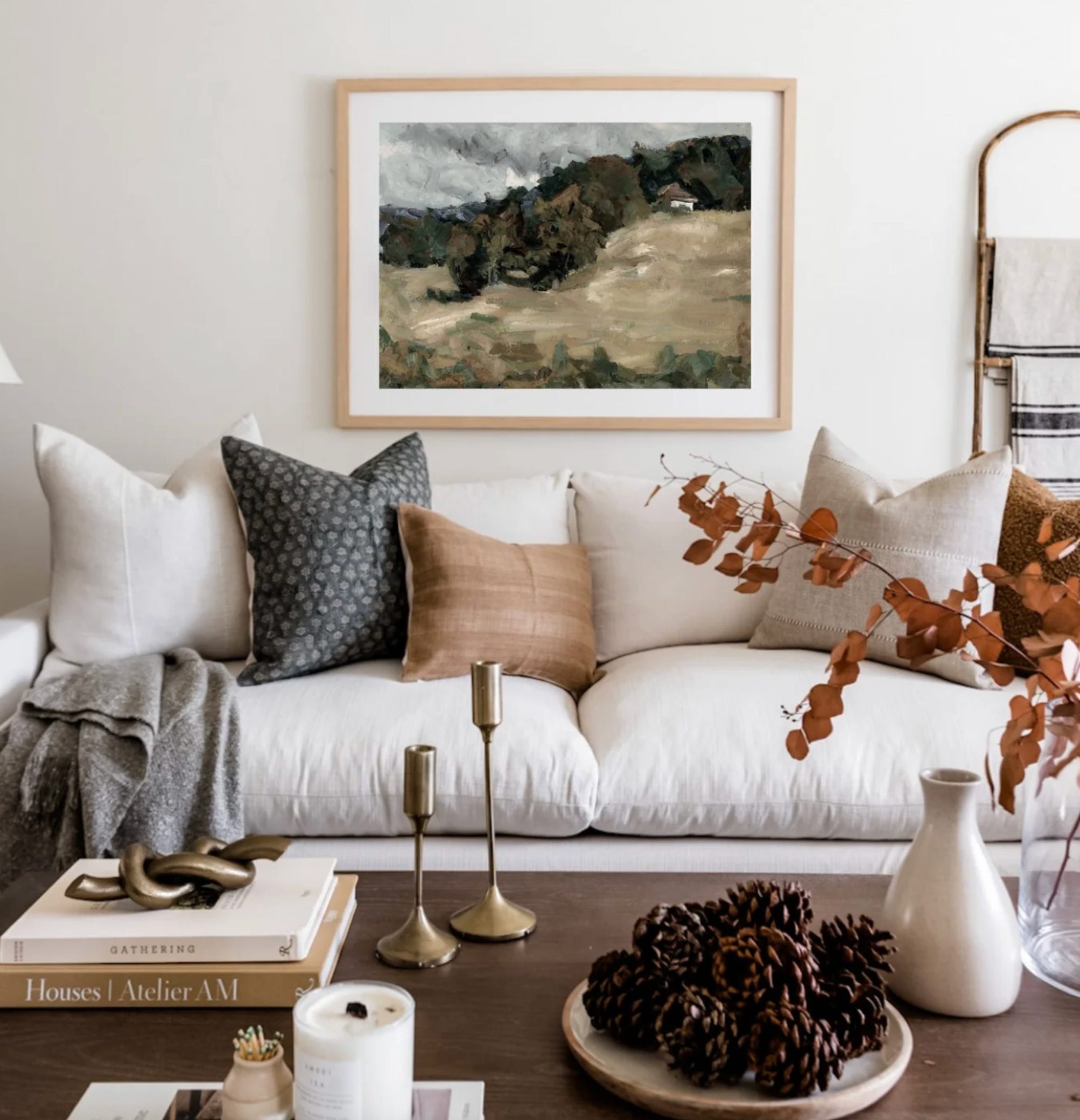 I like how some dark greens and blues are mixed in with the typical fall palette in this living room. (Photo: Collection Prints)
