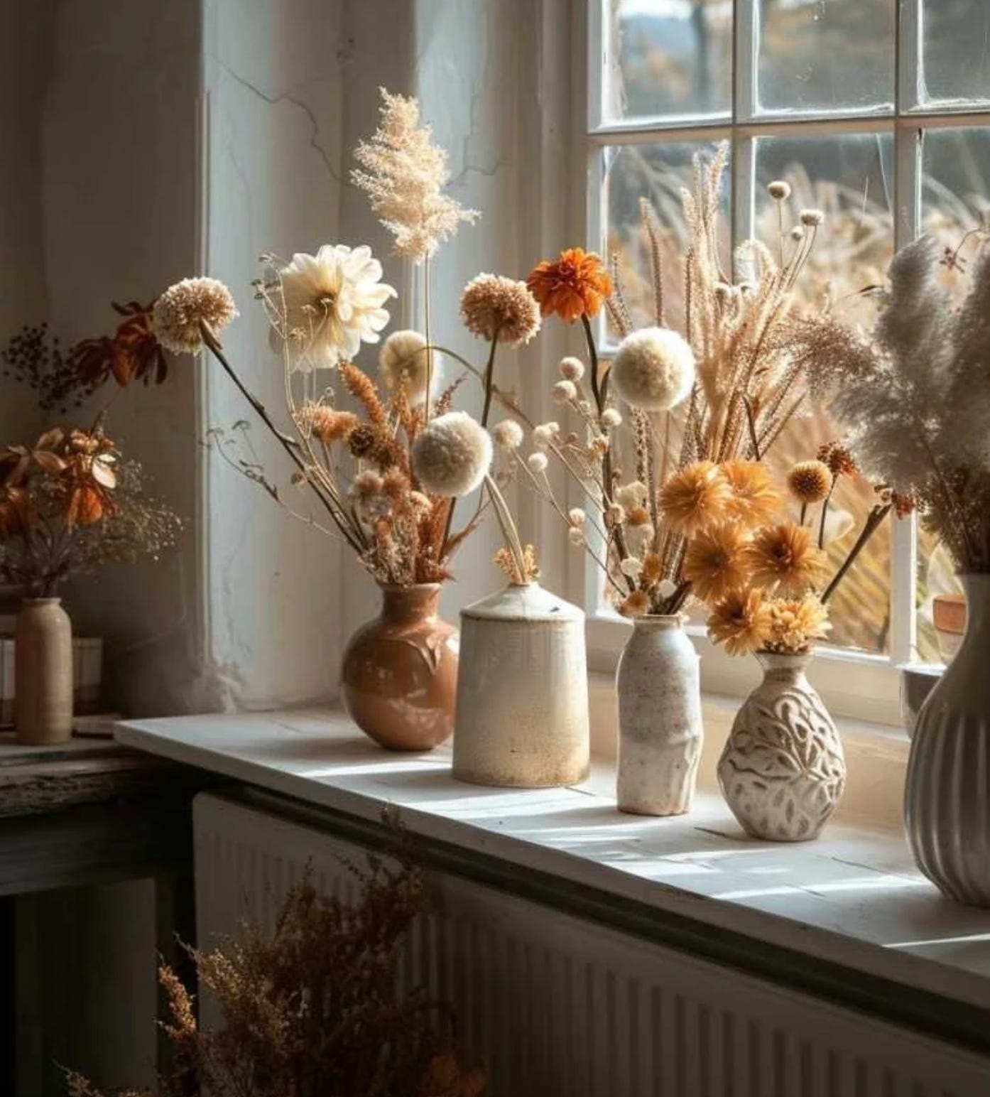 This stunning lineup of dried flowers in unique vases is all you need to do for spectacular fall design. (Photo: Hello Hayley)