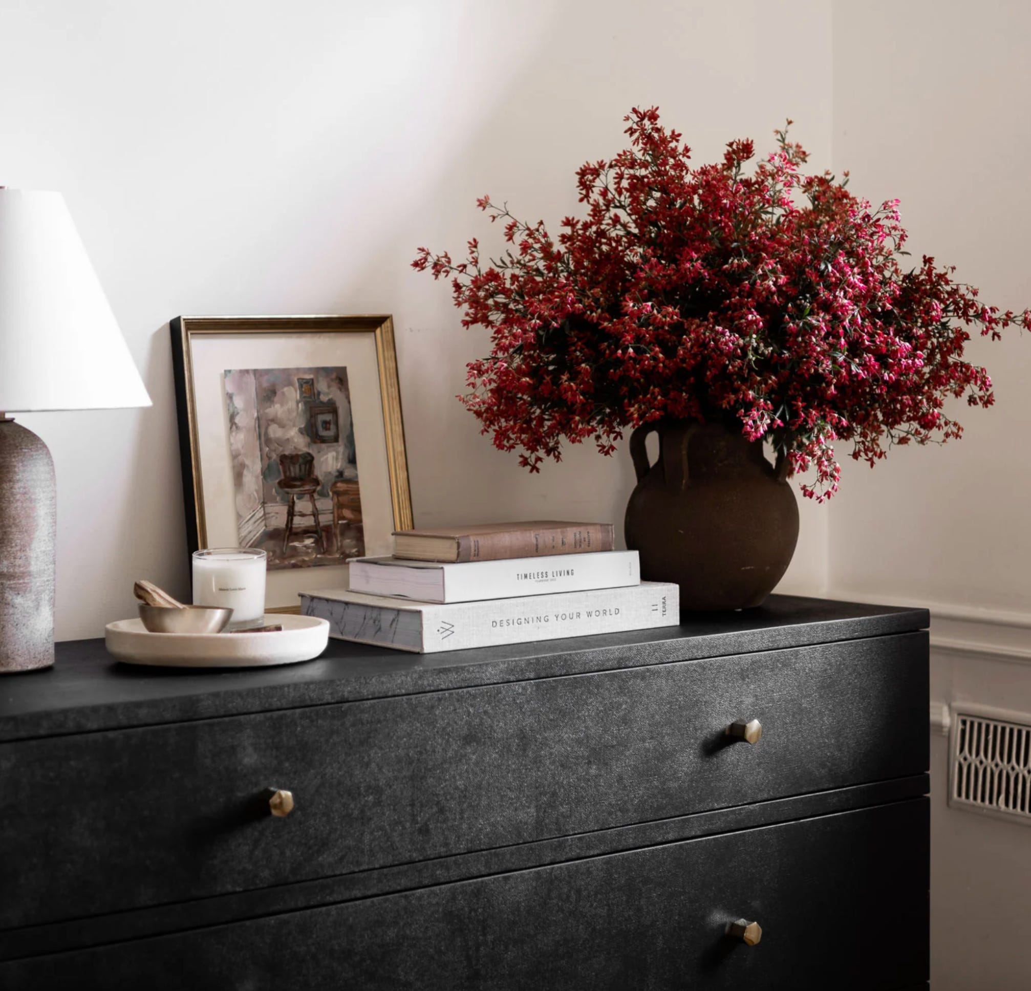 Deep red flower or berry sprays in a striking clay vessel punctuate a dark dresser. Create compositions made with items you already have. (Photo: Amber Interiors)