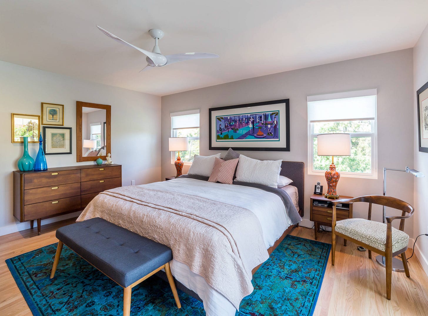 For contrast, this midcentury bedroom excites the eye while still conveying restfulness and good taste. Walls and bed maintain clean neutrality while benefiting from the deep blue details in the rug, foot bench, and painting.
