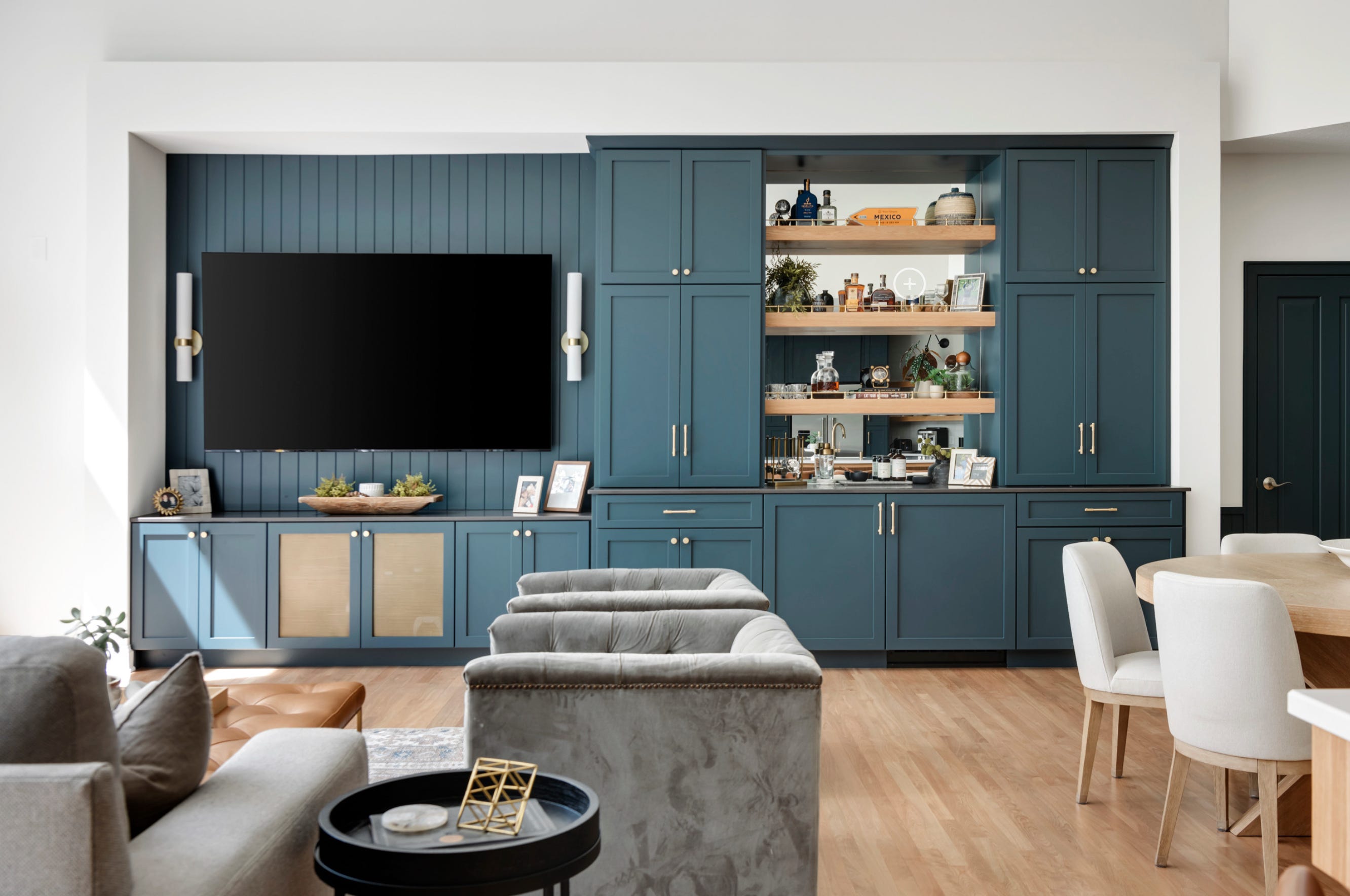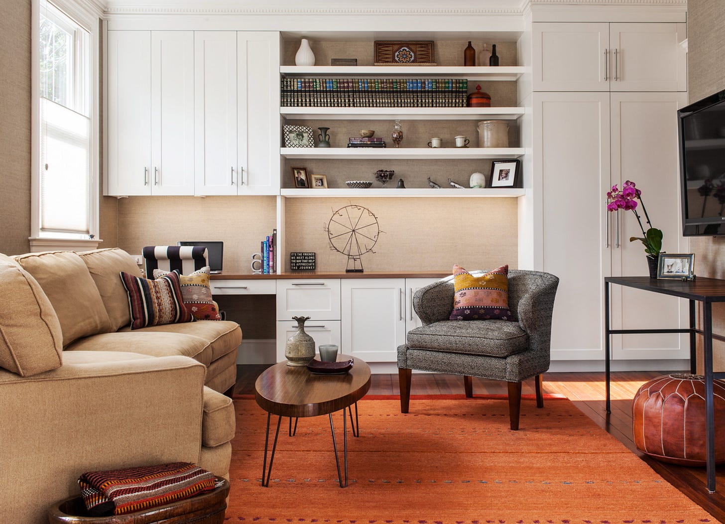 One idea for a blank wall: Add a bank of built-in shelves and cabinets. (Photo: Houzz)