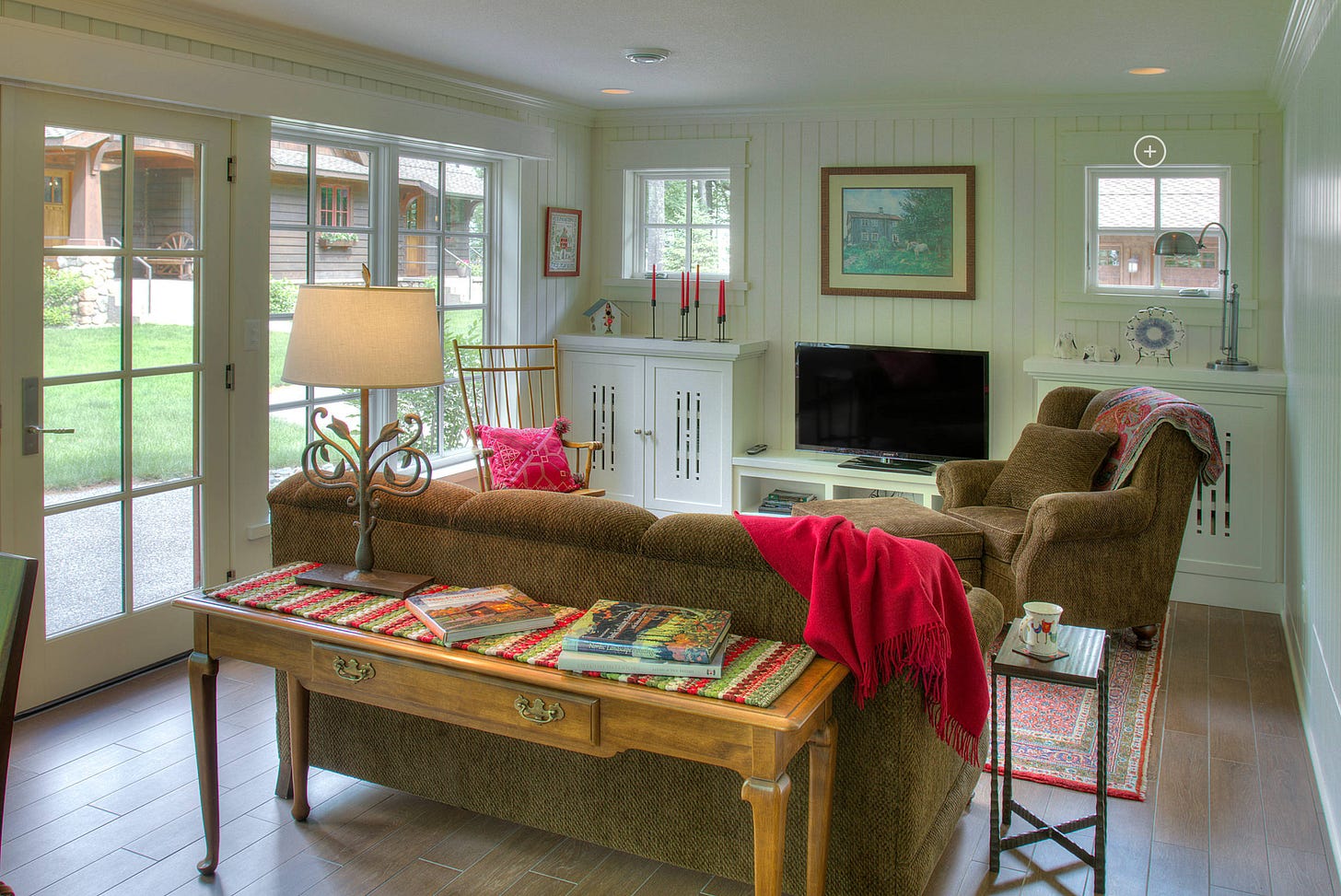 This farmhouse-style room might not be to your taste, but I think the seating and TV wall are designed really well. This could be imitated in the room we’re examining. (Photo: Houzz)