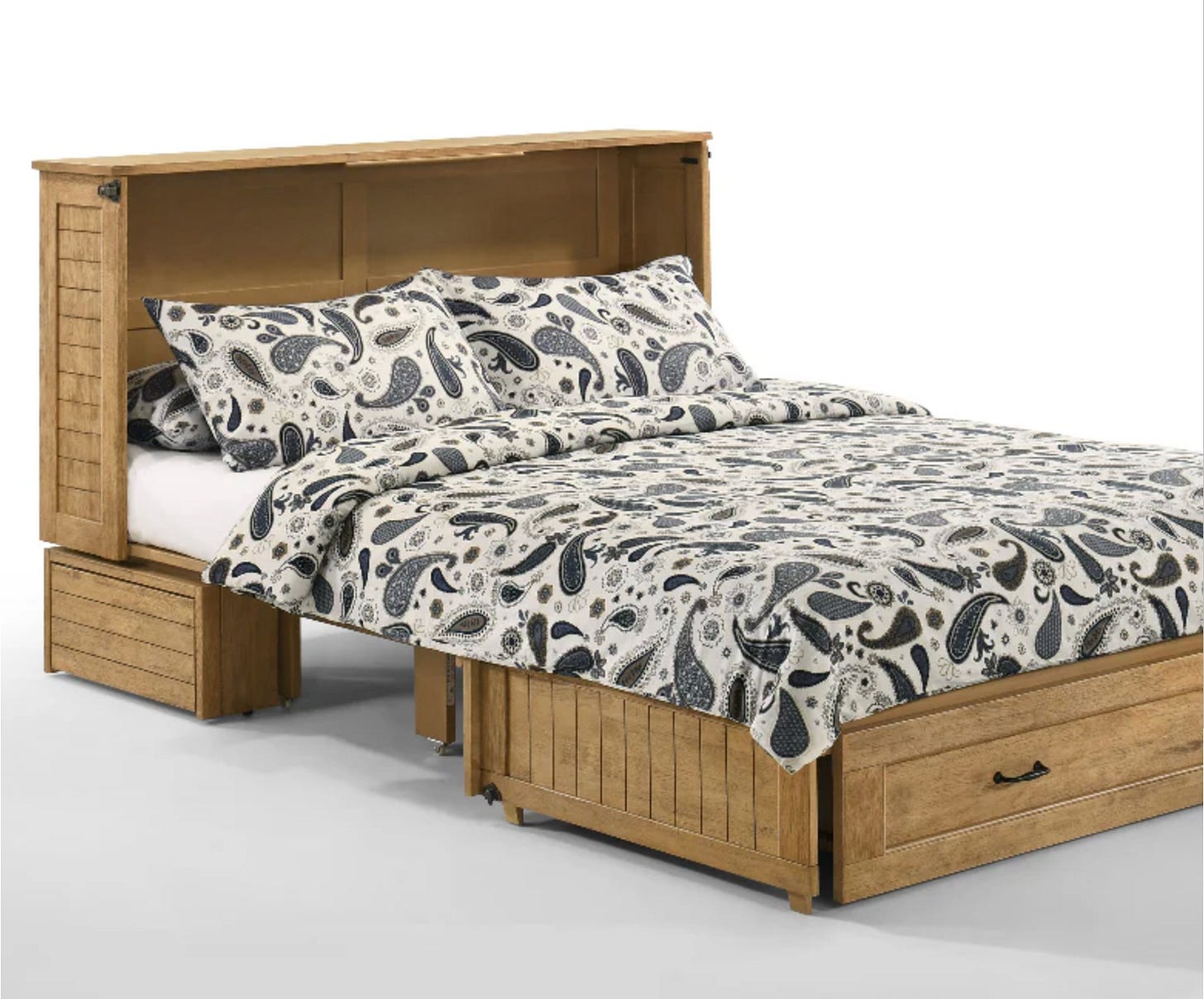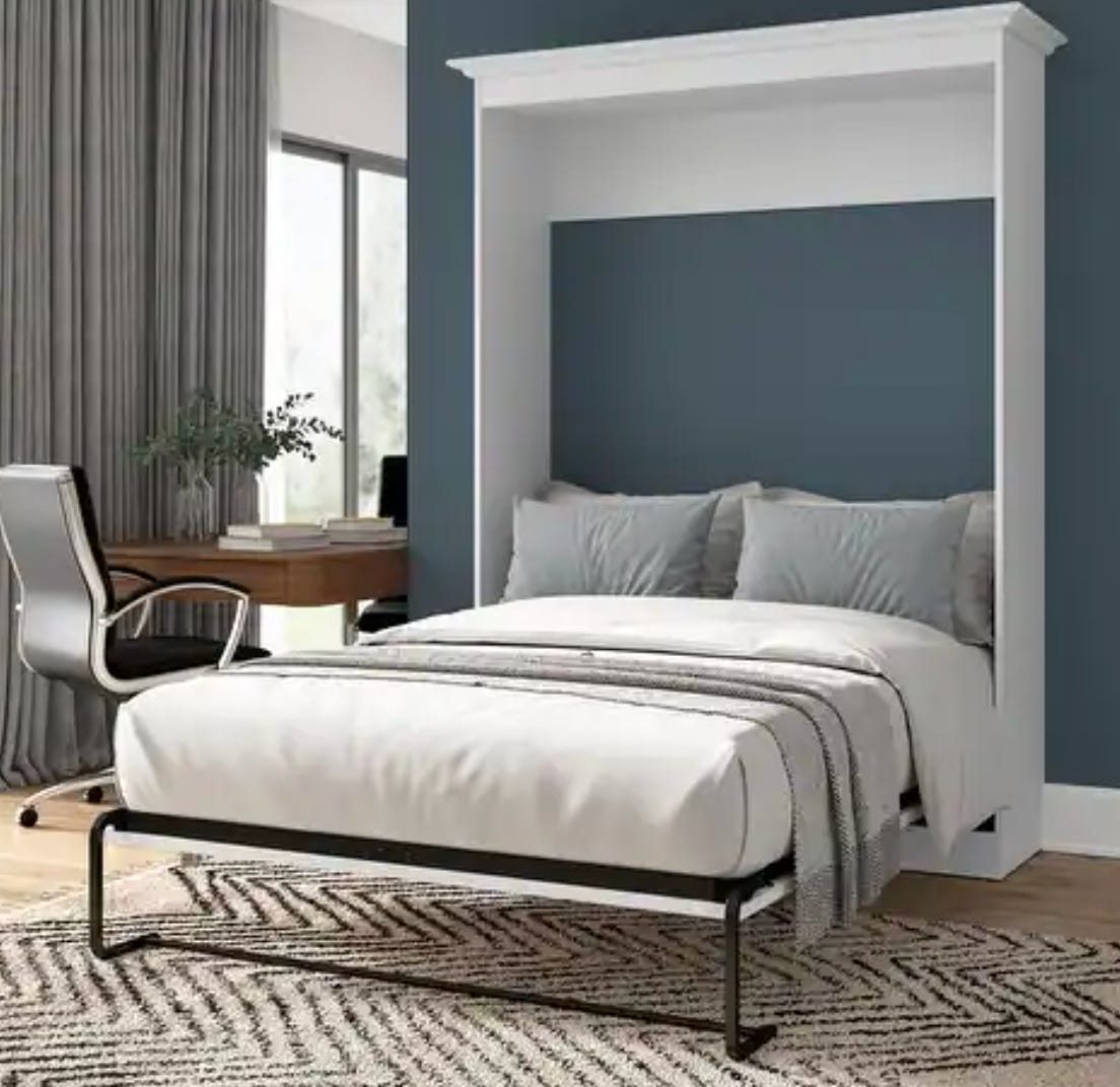 The full Murphy bed appears to be a large cabinet by day, and pulls down into a twin, full, queen, or king bed by night. The mattress is very comfortable, just like a regular bed, and they come in a variety of designs (formal, beachy, modern, farmhouse, etc.) and finishes.