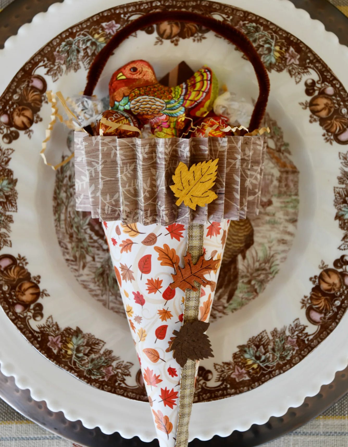 It’s made with scrap paper sheets you find easily in craft stores or online. Fill it with candy or a note of gratitude, whatever strikes your fancy. Your guests will love it and will remember your tiny Thanksgiving feast for many years to come.