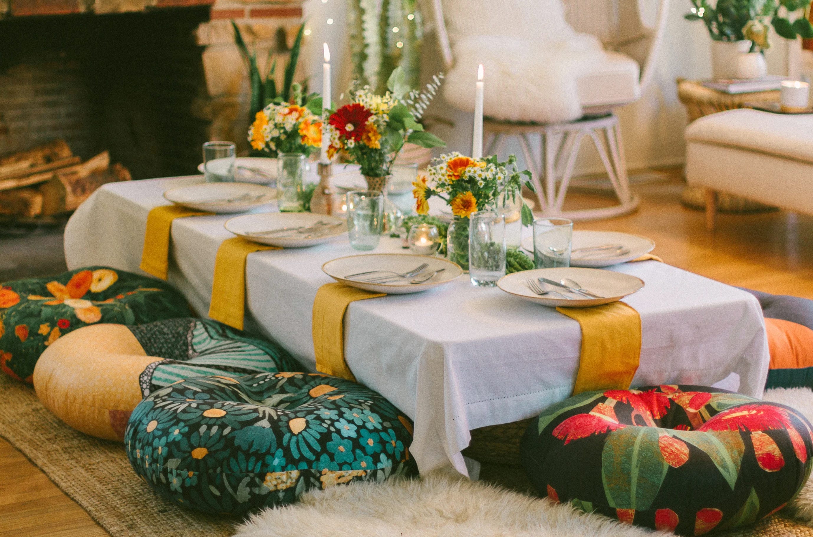Here is another idea I thought was perfect for the tiny Thanksgiving: bring the action down to earth (or close to it). Set up your table Eastern style with low comfortable seating cushions. It’s casual but special and somehow the low profile makes the room feel less busy.