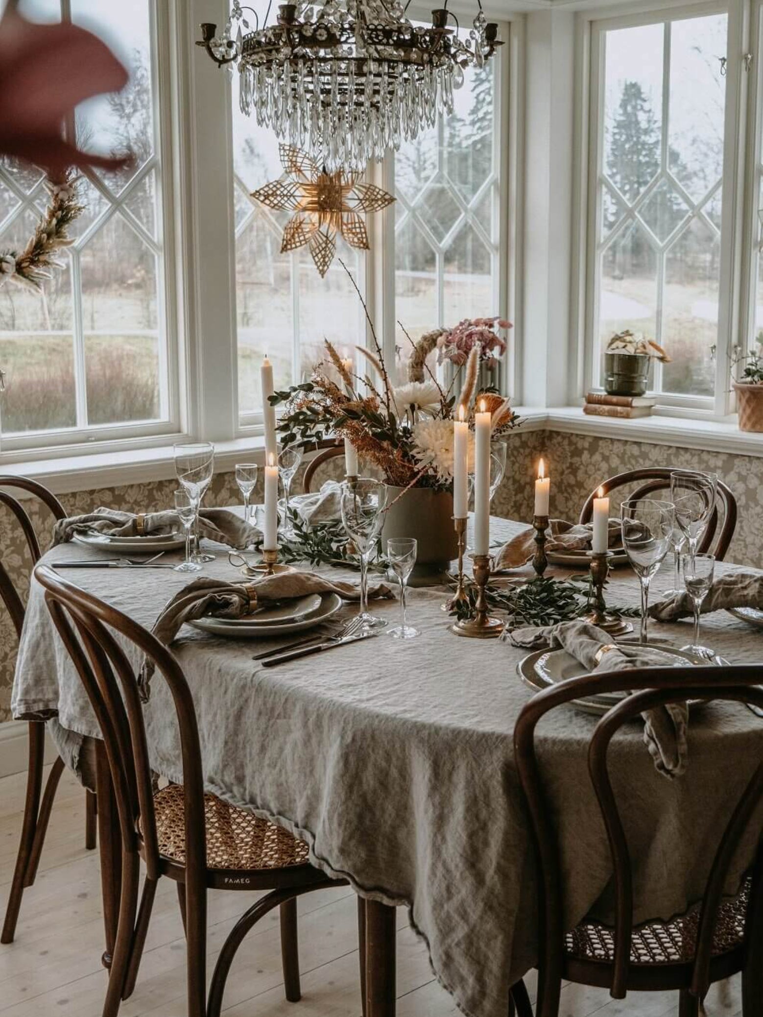 This narrow table tucks into a space near the window. It’s dressed a la française with a linen tablecloth, tarnished silver, and large candles with dried flower arrangements. (Photo: Cassandra Lavalle)