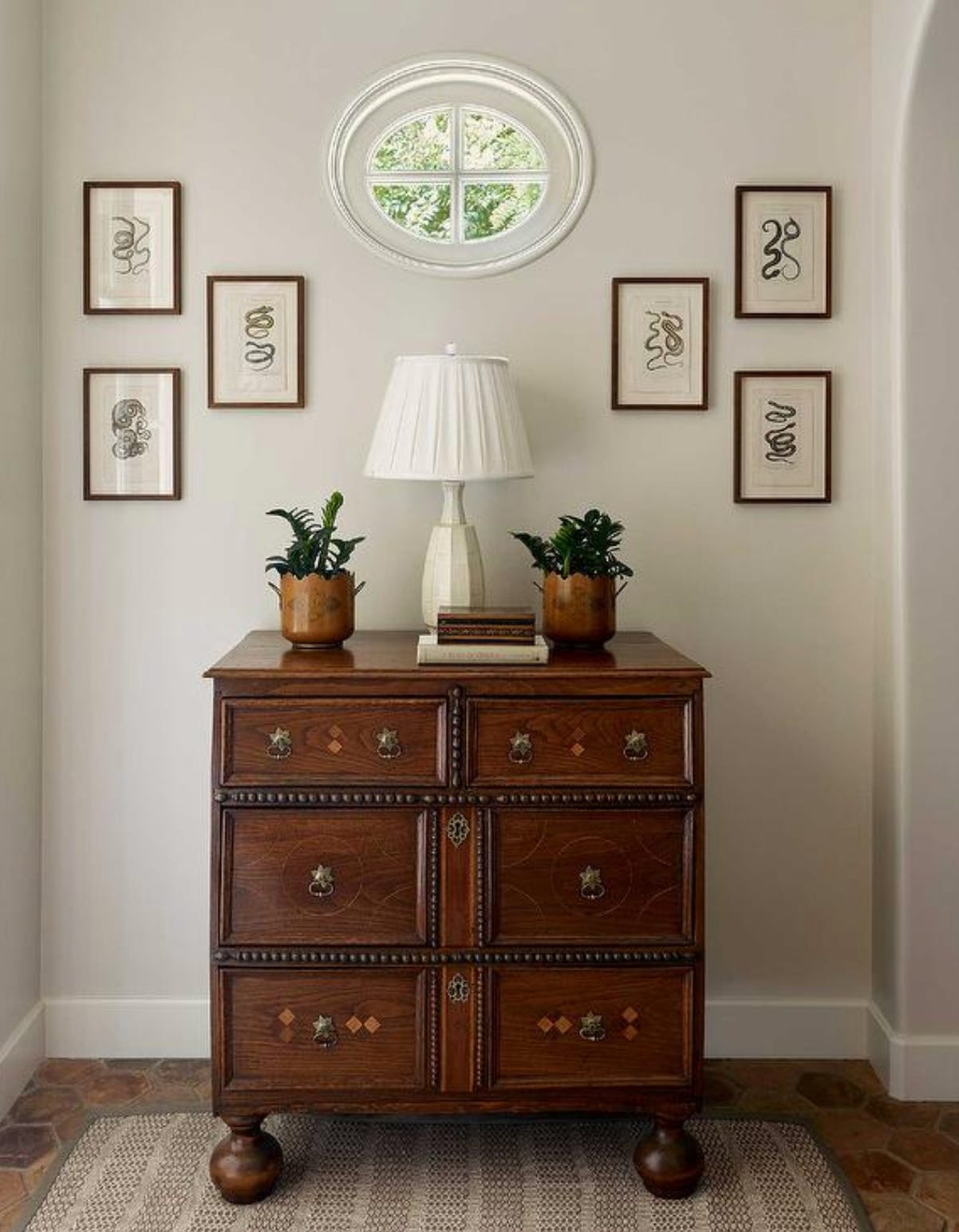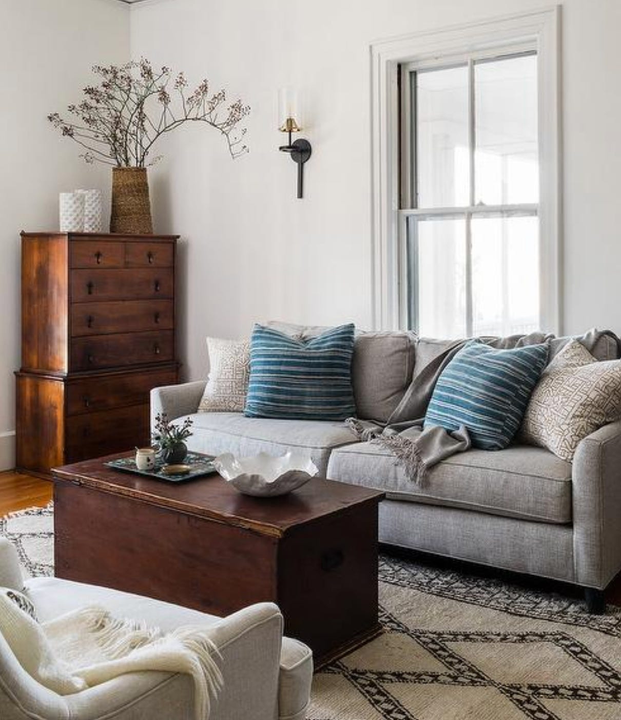 Antique wood furniture comes in a large variety of colors, wood species, and finishes. It’s made of solid wood components, in a time when old-growth and exotic woods weren’t on the brink of extinction. You are also rewarded with impeccable joinery and solid metal hardware. Dressed with eclectic art and patterned rugs, brown furniture is a real room upgrader.