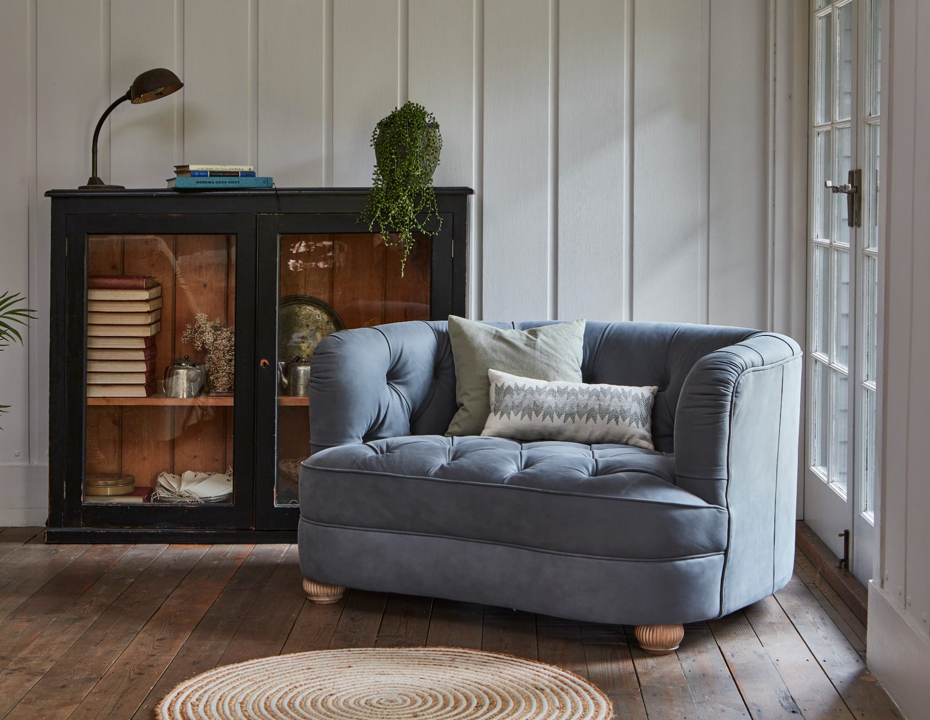 Clubby padded chairs like this one were considered dated not too long ago. But in this rather austere corner, its soft profile and silver-blue fabric is the perfect complement. (Photo: Darlings of Chelsea)