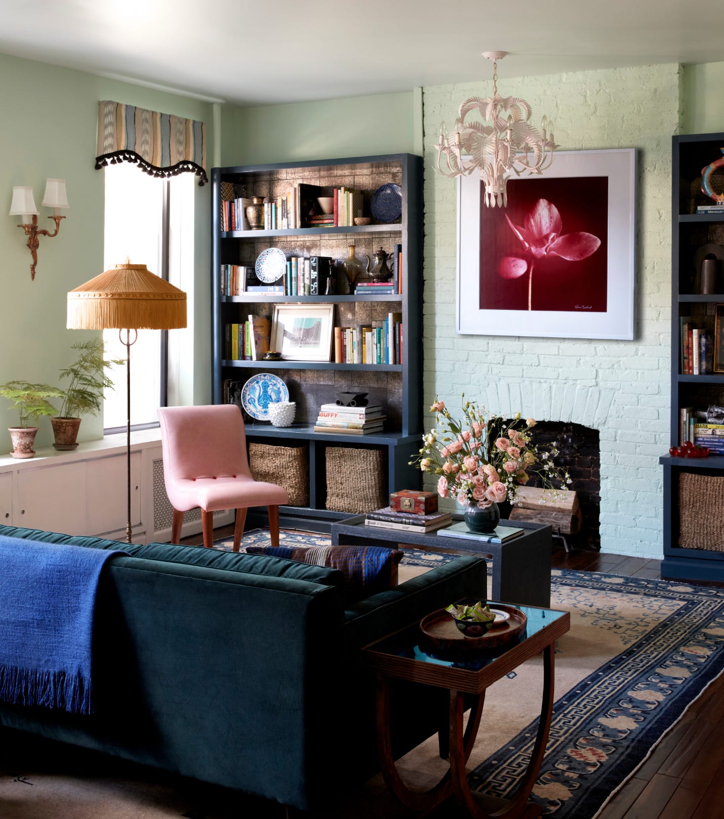 You wouldn’t think that pale green, ballet pink, and several shades of blue would be a good idea in an apartment living room, but this space proves you wrong. Notice how well spaced and proportional everything is, from the patterned window valance (with playful fringe) to the Asian rug with just enough neutral color in its center.